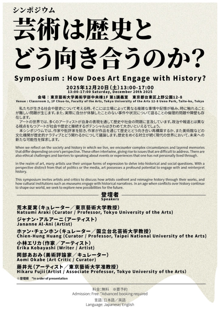 シンポジウム:芸術は歴史とどう向き合うのか? 日時:2025年12月20日(土) 時間:13:00-17:00(第一部13:00-15:30 各登壇者トーク/第二部15:30-17:00 ディスカッション) 会場:東京藝術大学 上野校地中央棟第一講義室 料金:無料 ※和英通訳付き 下記よりご予約ください。 https://forms.gle/sYx369VXTcSoCaC1A 登壇者とトークタイトル(登壇者順): 荒木夏実(キュレーター/東京藝術大学教授) 「歴史に向き合う態度:世界のミュージアムとアーティストの表現」 ジャナン・アルアーニ(アーティスト※オンライン参加) 「タイムライン」 ホァン・チェンホン(キュレーター/国立台北芸術大学教授) 「内戦の境界線: 近代以降の無制限戦争」 小林エリカ(アーティスト) 「女の子たちの戦争」 岡部あおみ(美術評論家/キュレーター) 「帝国主義のさざなみを聞く―スイス、日本、台湾の渚で」 藤井光(アーティスト/東京藝術大学准教授) 「アジアに沈む”自由”と”平和”」 概要: 私たちが生きる社会や歴史について考える時、そこには立場によって異なる複雑な事情や記憶が絡み、時に触れることが難しい問題が生じます。また、実際に自分が体験したことのない事件や状況について語ることの倫理的問題や障壁も存在します。  アートの世界では、多くのアーティストが自身の表現を通して歴史や社会の問題に言及しています。政治や報道とは異なる視点をもつアートが社会や歴史と接続するポテンシャルはきわめて大きいといえるでしょう。  本シンポジウムでは、作家や批評家を招き、作家が作品を通じて歴史とどう向き合い再築するか、また美術館などの文化機関が歴史的ナラティブとどう関わるかにつして議論します。歴史をめぐる対立が続く現代の世界において、未来への新たな可能性を探求します。 企画:荒木夏実(東京藝術大学美術学部先端芸術表現科教授) お問い合わせ先:s1323922@fa.geidai.ac.jp (先端芸術表現科 ちぇんしげ ) ※本研究はJSPS科研費 JP23K00208の助成を受けたものです